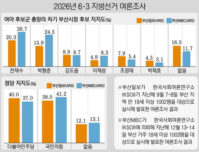 부산MBC가 KSOI에 의뢰해 지난해 12월 13~14일 부산 거주 18세 이상 1003명을 대상으로 실시한 여론조사에서도 ‘부산시장으로 적합한 사람이 누구인지’의 질문에 전 전 장관 26.7%, 박 시장 24.5%로 나타났다. 이 조사 역시 여야 후보군을 총망라한 다자 대결 구도로 진행했다. 이 여론조사는 전 전 장관의 통일교 금품 수수 의혹이 나온 이후 실시됐는데 여전히 적합도 1위를 유지했다.