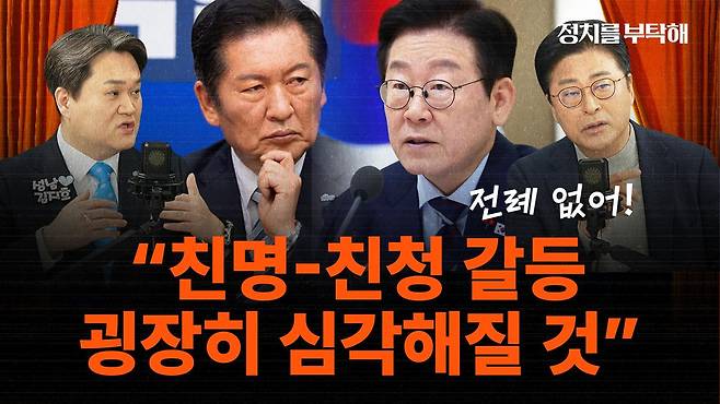 ▶ 김종혁: 그런데 정청래 대표가 하는 것을 개혁이라고 얘기하는 것 자체에 저는 동의하기 어렵습니다. 그게 무슨 개혁 드라이브입니까? 그건 그냥 지금 벌어지고 있는 것은 그 대통령실과의 갈등이죠. 오죽하면 비서실장이 나와서 대통령실 제발 끼워 넣지 말라라고 얘기를 하고 그다음에 그 얘기하잖아요. 우리 빨간 거 파란 거 같이 가야 되는데 뭐 이렇게 대통령은 계속 얘기하고 있습니다. 그런데 정청래 대표는 뭐라고 그래요? 내란당 빨리 해산해야 돼 뭐 이런 식으로 얘기하면서 다른 사람들에게 모두 총질하고 있는 거 아닙니까? 그래서 어떻게 보면 정치력이라는 것들을 전혀 찾아볼 수 없는 그런 일방적인 밀어붙임인데 그런 걸 무슨 뭐 그걸 개혁이라는 이름으로 포장하는 것 자체가 저는 그건 정말 굉장히 우스꽝스럽다라는 생각을 해요. 그래서 민주당 내에서 대통령과 대통령실과 이른바 친명과 친척의 갈등이 어떻게 될지 겉으로는 얘기 안 하지만 사실상은 이미 굉장히 심각한 거 아니에요? 정권 초기에 이렇게까지 심각한 갈등이 벌어진 사례를 본 적이 없어요. 그래서 이게 아마 당 대표 선거를 놓고서는 이 지방선거 이후에 굉장히 심각하게 지방선거 결과에 대한 평가도 마찬가지고 심각해질 것이다. 저는 그렇게 생각을 합니다.