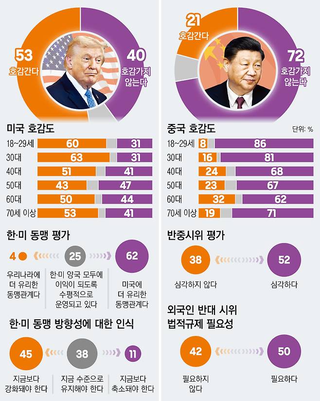 경향신문 신년 및 창간 80주년 여론조사 결과 중국에 대한 호감도가 21%에 불과한 것으로 나타났다. 국내에서 벌어지는 반중시위가 심각하다며 우려하는 의견은 절반을 넘었고, 반중 시위와 같은 외국인 반대 시위를 법으로 규제해야 한다는 의견도 절반을 차지했다. 미국에 대한 호감도는 53%로 나왔지만 도널드 트럼프 2기 미국 행정부가 출범한 이후의 한·미 동맹은 “미국에 유리한 동맹”이라는 응답이 우세했다.