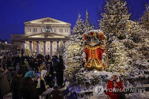 epa12619585 People take pictures of light decorations in front of the Bolshoi Theatre building during New Year's Eve celebrations in Moscow, Russia, 31 December 2025. Fireworks displays on New Year's Eve and Christmas have been canceled in Moscow. Red Square is closed to visitors from 6:00 pm on 31 December 2025 to 8:00 am on 01 January 2026. Security measures will be strengthened in the center of the capital. The restrictions are related to a special military operation in Ukraine, the authorities stated. EPA/SERGEI ILNITSKY