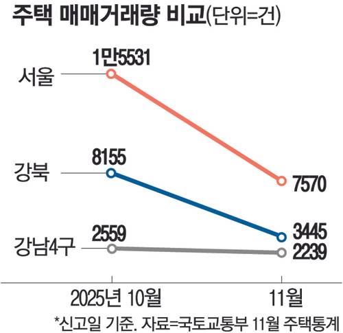 31일 국토교통부에 따르면 2025년 11월 서울 주택 매매 거래량(신고일 기준)은 총 7570건으로 전달(1만5531건)에 비해 51.3% 감소했다. 서울은 10·15 대책으로 전역이 규제지역으로 지정되고, 아파트는 토지거래허가구역까지 ‘삼중 규제’로 묶이면서 거래가 급감한 상태다.