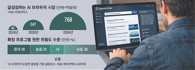 AI 브라우저가 차세대 검색 방식으로 주목받고 있음에도 보안 리스크가 해소되지 않으면 확산 속도에 제동이 걸릴 수 있다는 분석이 나온다. 글로벌 시장조사 업체 마켓닷어스는 AI 브라우저 시장이 2034년까지 연평균 32.8% 급성장할 것으로 예상했지만, 업계에서는 보안 이슈가 성장의 핵심 변수로 작용할 수 있다고 보고 있다.