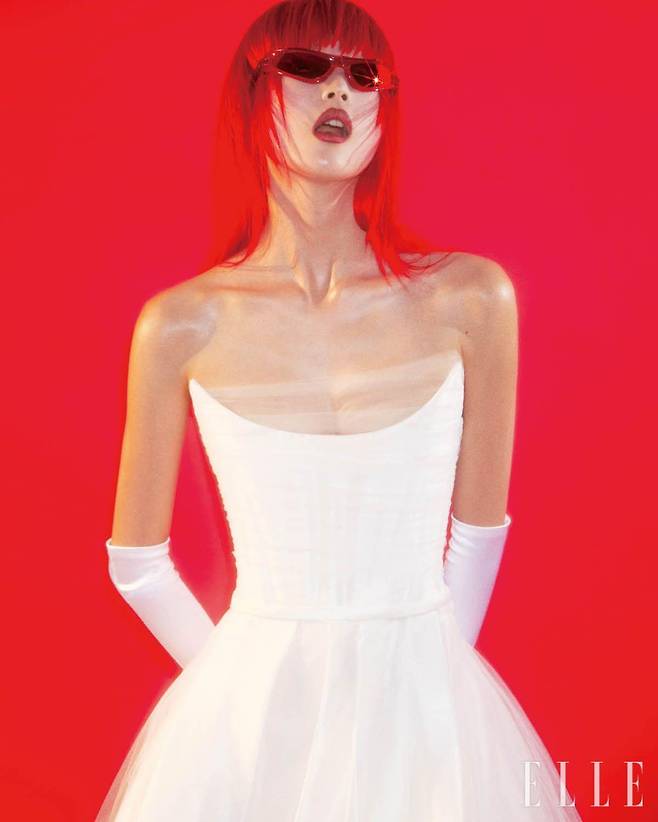뷔스티에 드레스는 9백55만원, Alex Perry by Kayla Bennet. 레드 프레임의 선글라스는 52만원, Gentle Monster. 장갑은 에디터 소장품.