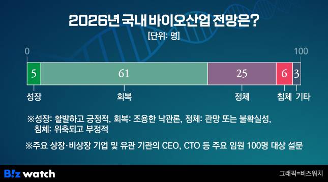비즈워치가 국내 주요 상장·비상장 제약바이오 기업 및 유관 기관의 CEO, CTO 등 핵심 임원 100명을 대상으로 실시한 '2026년 바이오산업 전망' 설문조사 결과, 과반수가 시장의 회복을 점쳤다. 그 이면에는 냉철한 현실 인식도 자리 잡고 있었다.