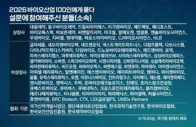 올해 'K-바이오' 산업은 어떻게 될 것이라고 보시나요? 비즈워치는 신년기획으로 업계 최고경영자(CEO), 최고기술책임자(CTO) 등 주요 임원 100명을 대상으로 설문조사를 실시했습니다. 현상에 숨겨진 의미를 해석하고 본질을 깊이있게 들여다보기 위해 연락을 돌렸습니다. 경기 전망부터 투자 환경, 주목해야 할 연구개발 분야, 인력 및 정책 과제 등 산업 생태계 전반에 대해 꼼꼼히 물어봤습니다. 바이오 업계 리더들이 진단하는 2026년 K-바이오 산업은 어떨지 함께 보시죠. [편집자주]