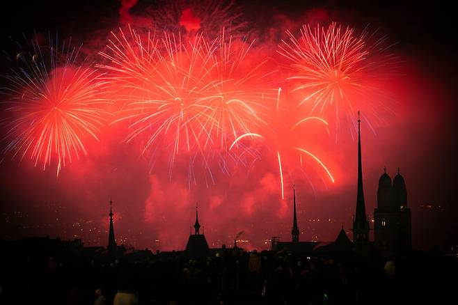 [취리히=AP/뉴시스] 1일(현지 시간) 스위스 취리히에서 새해맞이 축하 불꽃이 밤하늘을 밝히고 있다. 2026.01.01.