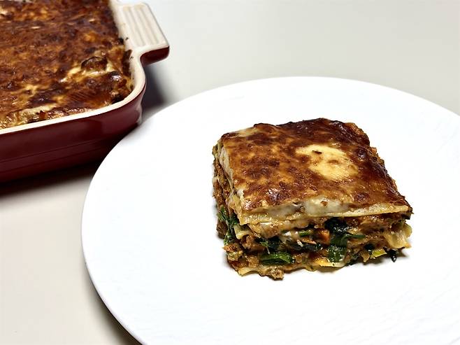 정식으로 하려면 베사멜 소스와 뭉근하게 끓여낸 라구 소스가 필요하지만, 그런 복잡한 과정과 오랜 조리 시간 없이도 시금치와 리코타 치즈로 베사멜 소스를 대신해 맛있는 한 끼를 만들 수 있다.