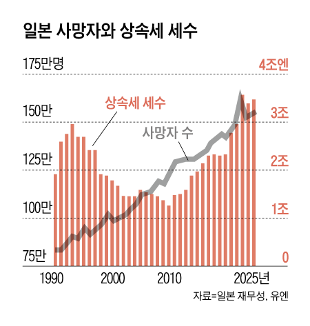 일본에선 단카이 세대 사망자가 늘어나는 현상을 뜻하는 ‘다사사회(多死社會)’란 신조어까지 등장했다. 단카이 세대가 남긴 재산 중 일부는 상속세를 통해 정부로 귀속되며 일본의 재정 부담에 다소 숨통을 틔워주고 있다. 일본 국세청에 따르면 2005년 약 1조5000억엔 정도였던 일본의 상속세 세수는 2024년 3조4000억엔 수준으로 불어났다. 일본의 한 해 사망자 수가 약 133만명에서 154만명으로 증가하며 생긴 일이다. 이는 한동안 더 늘어날 가능성이 크다. 유엔 인구 추계에 따르면 일본의 사망자 수는 2038년 165만명에 달할 때까지 꾸준히 늘어날 전망이다.