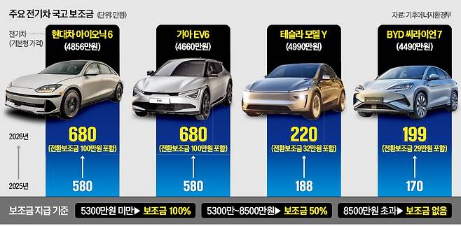 에너지밀도가 낮아 주행거리가 짧은 리튬·인산철(LFP) 배터리를 쓰는 미국 테슬라 모델Y는 기본 보조금이 낮은 탓에 전환지원금도 적게 지원되면서 총 보조금이 220만원 수준으로 책정됐다. 똑같은 LFP 배터리를 쓰는 중국 비야디(BYD) 씨라이언7 역시 199만원 안팎이 될 전망이다.