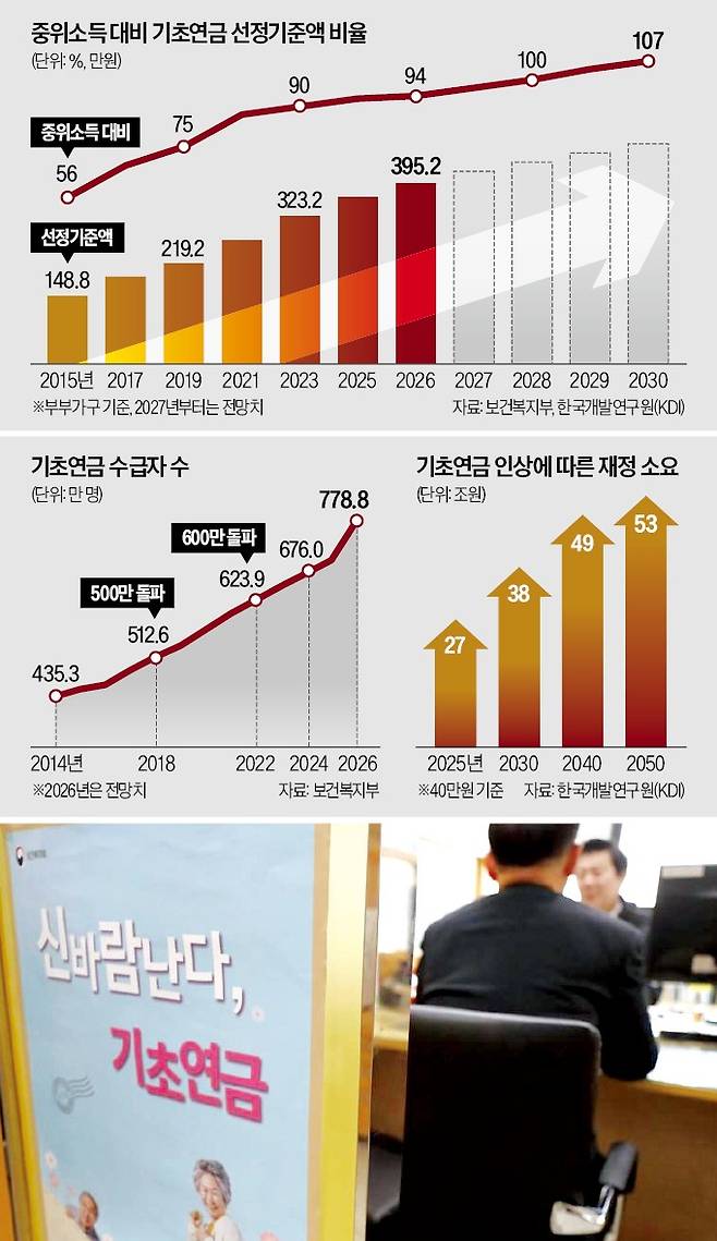 올해 65세 이상 노인 중 기초연금을 받는 사람이 최대 778만8000명으로 전년 대비 77만 명 늘어날 전망이다. 수급자 증가폭은 2025년(25만 명)의 세 배를 웃도는 사상 최대 수준이다. 2년 새 늘어난 수급자가 102만 명에 달한다.