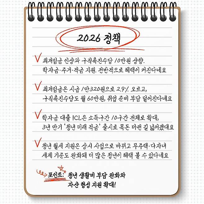 ▶ 최저임금은 시급 1만320원으로 2.9% 오르고, 구직촉진수당도 월 60만원으로 올라 취업 준비 부담이 덜어진다네요.
