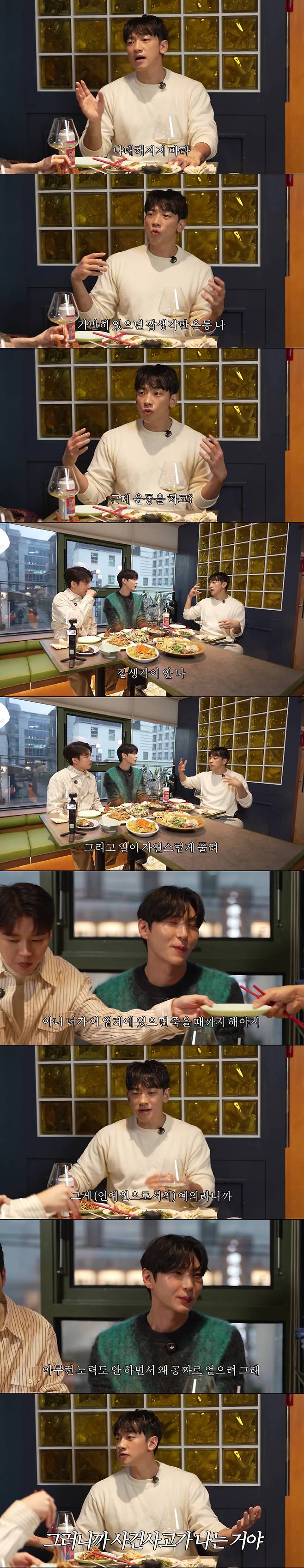 이에 정택운은 "저도 우현이도 정말 열심히 자기관리를 하고 있다. 10년 넘게 운동도 하고, 1일 1식도 해봤는데 언제까지 이렇게 해야 하나 싶어 힘들다"고 토로했다. 그러자 비는 "이 업계에 있는 한 죽을 때까지 해야 한다"고 단호하게 답했다. 그는 "그게 연예인으로서의 예의"라며 "아무 노력도 하지 않으면서 공짜로 얻으려고 해서는 안 된다. 스스로를 닳고 닳게 만들어야 보상이 따라오고, 그래야 그 보상도 더 달다"고 강조했다.