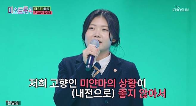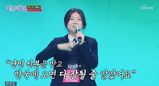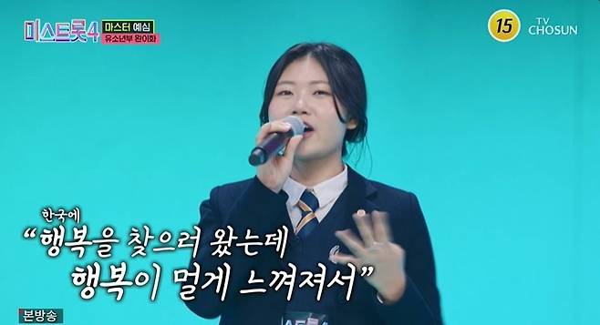 열아홉 살인 완이화는 "미얀마에서 온 고등학교 3학년 완이화다. 한국에 행복을 찾으러 왔는데, 행복이 자꾸만 멀어지는 것 같아서 '미스트롯4'에 출연했다"고 소개했다.