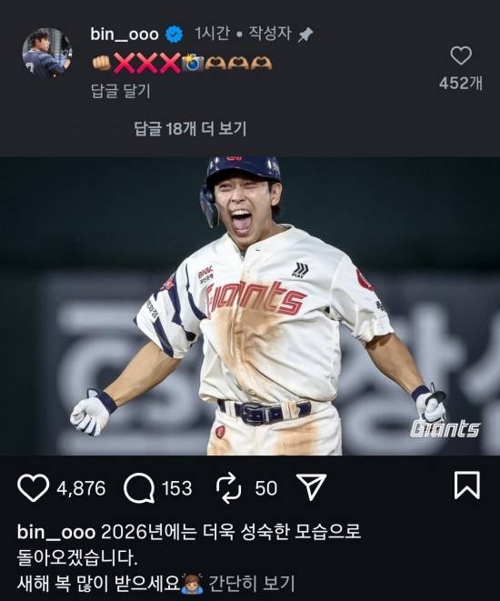 황성빈은 지난시즌 직후 손가락 철심 제거 수술을 받는 등 부상 없이 좋은 컨디션 만들기에 나섰다. 2026년 롯데 자이언츠의 숙원인 포스트시즌 진출을 위해 자신의 활약이 필요한 상황에서 새해 인사로 다부진 각오를 펼쳐보였다.