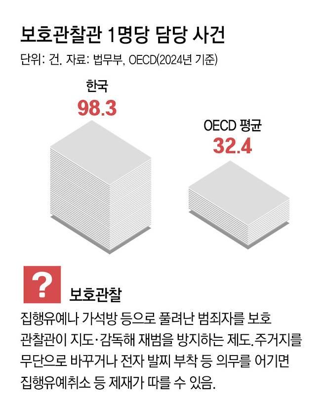 1명당 98건 담당, OECD 평균의 3배… 재범 고위험군 놓쳐 범죄 사례도