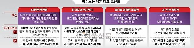 2026년에는 실험단계였던 첨단기술이 일상 속에서 공존할 전망이다. 인공지능(AI)은 기존의 모델 경쟁을 넘어 인프라 전쟁으로 확대하고, 스마트폰 영역에선 글로벌 ‘접기 대전’이 예상된다. 연이은 개인정보유출 사태로 위기감이 커진 보안 분야에서는 ‘AI 창’ 대 ‘AI 방패’의 승부가 펼쳐질 전망이다. 이런 변화를 감지할 첫 무대는 오는 6일(현지시간) 미국 라스베이거스에서 열리는 CES다.
