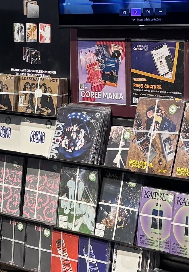 | ▲ 프랑스 최대 서점·음반 체인 프낙(FNAC)에 성탄용 선물세트로 포장된 케이팝 관련 음반들이 진열되어 있다. 코리아 마니아(Coree Mania) 라고 쓰여 있는 음반 패키지 상품이 눈에 띈다 |