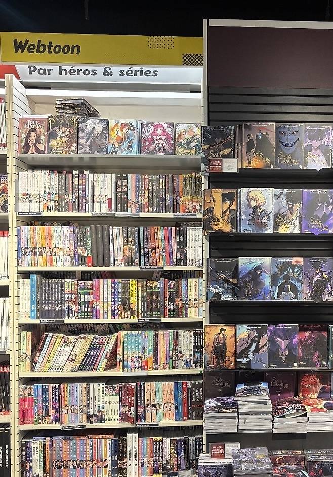 | ▲ 프랑스 최대 서점·음반 체인 프낙(FNAC)에서 만화 섹션의 한 코너를 차지하고 있는 웹툰 기반 만화(왼편)들, 최대의 히트작으로 꼽히는 Sole Leveling (오른편)이 보인다. |