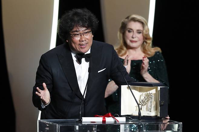 | ▲ 2019년 5월 제72회 칸국제영화제 최고상인 황금종려상을 수상한 영화 <기생충>의 봉준호 감독이 수상 소감을 밝히고 있다. |