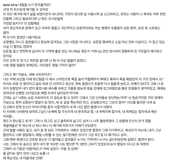 한편 권민아는 이번 글에서 유년 시절의 가정폭력, 연습생 시절의 위계 문화, AOA 활동 당시의 심리적 압박 등도 함께 언급하며, 자신의 삶을 관통해온 불안과 상처를 차례로 꺼냈다. 그는 “모든 상황에서 증거가 얼마나 중요한지, 그리고 증거가 없을 때 피해자가 얼마나 고립되는지 말하고 싶었다”고 강조했다.