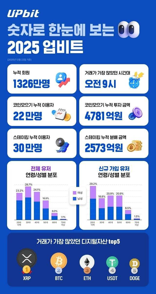2일 업비트 운영회사인 두나무에 따르면, 2025년 한해 업비트에서 가장 많이 거래된 가상자산(암호화폐·코인) 종목 1위는 리플이며, 비트코인(BTC)과 이더리움(ETH)이 뒤를 이었다.