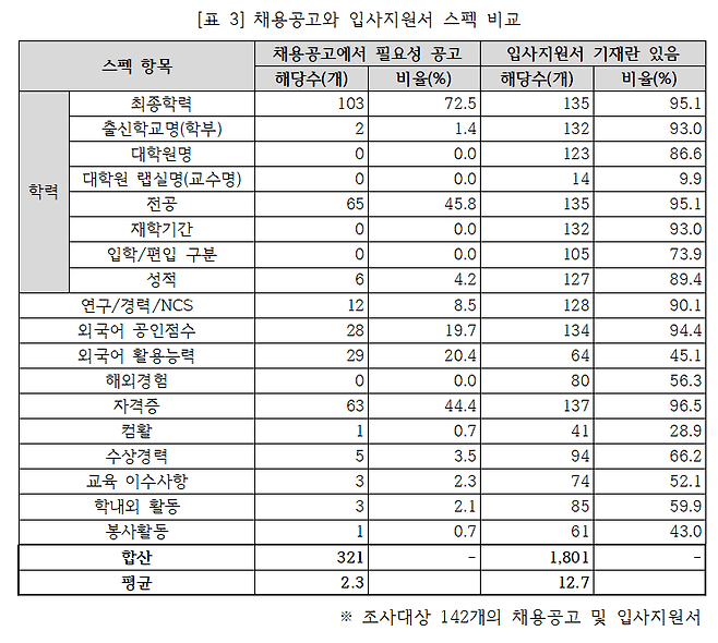 기업들이 채용공고에서는 역량 중심으로 인재를 선발할 것처럼 명시해놓고 있지만 정작 입사지원서에서는 '스펙' 기재란을 통해 학력·외국어·자격증 등 평균 10개 이상의 자격요건을 요구하고 있는 것으로 나타났다. 이 때문에 청년 구직자들이 스펙 경쟁에 내몰릴 수밖에 없다는 지적이 나온다.