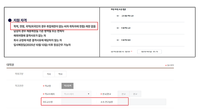 지원서 기재란에 가장 빈번히 오른 항목은 '학력'으로, 전체 조사기업 중 95.1%가 지원자의 '최종학력'을 요구했다. 채용공고에서는 72.5%만이 학력을 본다고 내걸었던 것과는 차이가 있다. '전공(95.1%)' '출신 학교명(93.0%)'은 물론이고 편입 여부를 확인하는 '입학·편입 구분(73.9%)'란도 있었다. 대학원 졸업생에게는 '연구실 이름·교수 이름'을 쓰라고 하는 경우도 9.9%에 이르는 것으로 집계됐다.