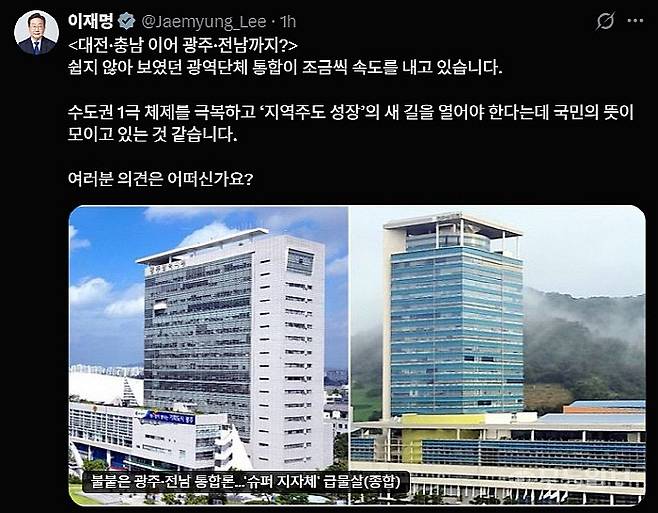 이 대통령은 표면적으로는 여론을 묻는 형식이지만 사실상 광주·전남 행정통합을 강하게 지지하는 메시지로 해석된다.