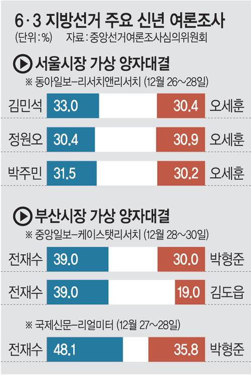 6·3 전국동시지방선거를 약 5개월 앞두고 발표된 신년 여론조사에서 서울시장 자리를 두고 여야가 엎치락뒤치락 중인 것으로 나타났다. 부산시장은 전재수 더불어민주당 의원이 앞서고 있다는 결과도 나왔다. 국민의힘이 서울·부산 사수를 목표로 내건 가운데 두 지역 모두 안심할 수 없는 결과가 나오자 2일 야권 내 위기감이 커지는 모습이다.