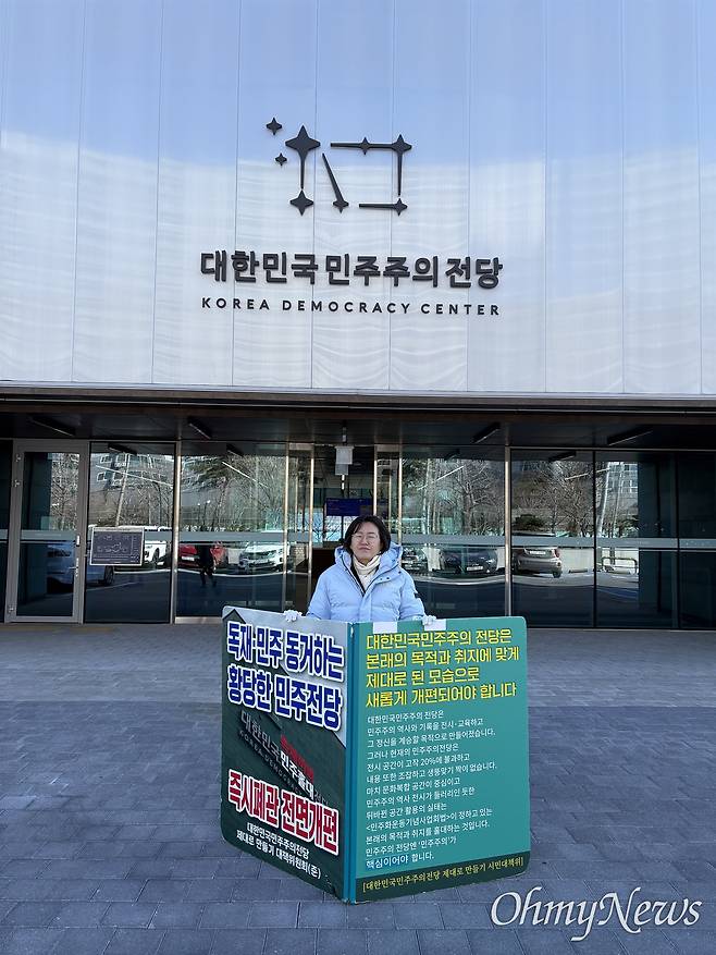 창원마산 김주열 열사 시신인양지 옆에 들어선 대한민국민주주의전당(아래 민주전당) 관련한 논란이 계속되는 가운데, 진보당 정혜경 국회의원(비례)이 '즉시폐관-전면개편'을 촉구하는 1인시위를 벌였다.