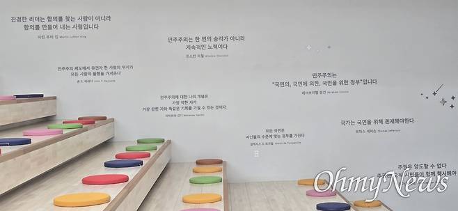 1인시위를 마친 뒤 민주전당을 둘러보았다고 한 정 의원은 "1층 입구에 들어 섰더니 제일 먼저 눈에 들어오는 전시 내용부터 부담이었다"라며 "외국 유명인사 등의 민주주의 관련 명언들을 벽에 붙여 놓았는데, 제일 먼저 거부감이 들었다"라고 말했다.