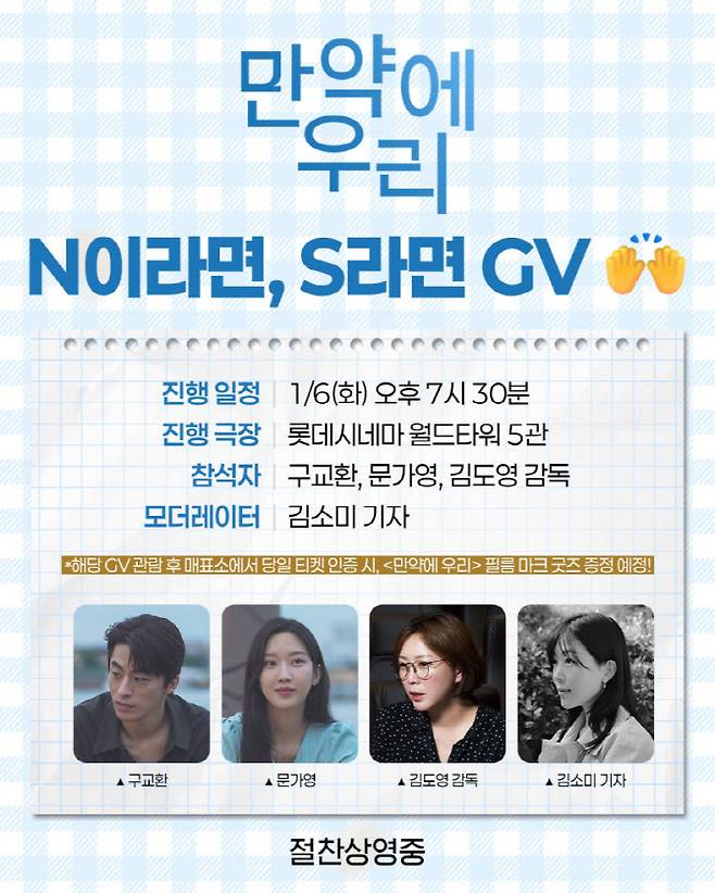 [이데일리 스타in 김보영 기자] 이틀 연속 한국 영화 박스오피스 1위를 수성하고 있는 영화 ‘만약에 우리’(감독 김도영)가 오는 6일 오후 7시 30분 롯데시네마 월드타워에서 특별한 관객과의 대화(GV)를 진행한다.