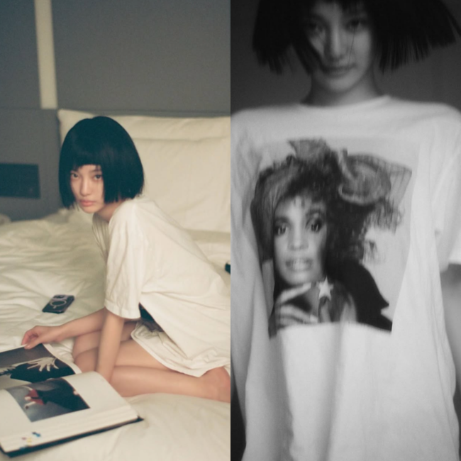 닝닝은 흰색 티셔츠 차림으로 카메라를 응시하며 담백한 스타일링을 완성했다. 별다른 장식 없이도 단발 헤어스타일만으로도 확연히 달라진 인상을 남겼다.