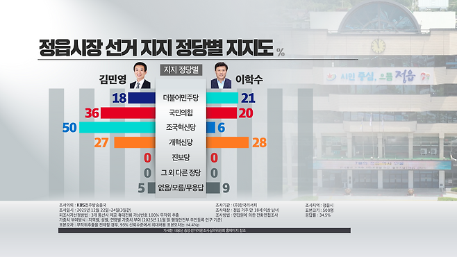 지지 정당별로 보면 조국혁신당 지지층에서 김민영 전 정읍산림조합장의 지지도가 높았고, 민주당 지지층은 이학수 현 정읍시장을 가장 많이 지지했습니다.