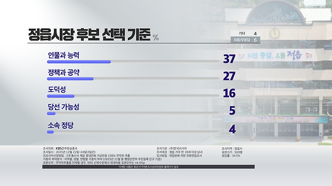 정읍시장 선택 기준은 인물과 능력 37%, 정책과 공약 27%, 도덕성 16%, 당선 가능성 5%, 소속 정당 4% 등의 순이었습니다.