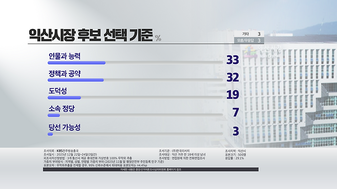 익산시장 선택 기준은 인물과 능력이 33%로 가장 높았고, 정책과 공약 32%, 도덕성 19%, 소속 정당 7%, 당선 가능성 3%로 나타났습니다.
