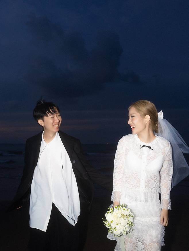 공개된 사진 속 두 사람은 바닷가와 들판을 배경으로 서로를 다정하게 응시하며 환한 미소를 짓고 있다. 특히 레이스 디테일이 돋보이는 웨딩드레스에 운동화를 믹스매치한 윤훼이의 힙한 스타일링과 세우의 세련된 슈트 핏이 눈길을 사로잡는다.