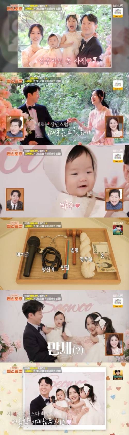 특히 돌잔치 하이라이트는 단연 돌잡이로 후보군에는 마이크, 청진기, 연필, 법봉, 명주실, 돈 등이 있었다. 앞서 첫째 딸 서아는 의사를 의미하는 청진기를 잡았다고. 이때 둘째딸 서우는 고민하다 마이크를 잡았고, 이를 간절히 원하던 의사 남편과 시댁 식구들은 환호를 외쳤다.