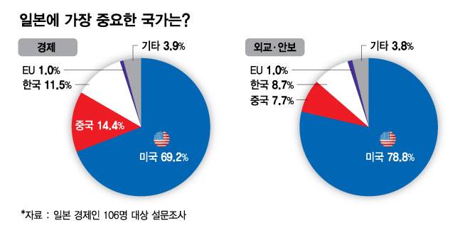 한일 양국은 항상 시선이 '위'(미중)를 향하고, '옆'(한일)'을 보지 않는다. '미국에 어떻게 평가될까', '중국의 압력을 어떻게 피할까'라는 수직 방향의 생존 전략에는 필사적이지만 '한일이 손잡고 지역을 주도한다'는 수평 방향의 전략적 상상력이 결여돼 있다. '미국하고만 손잡으면 살아남을 수 있다'는 환상이 한일 독자 경제권이라는 플랜B에 대한 절박감을 약화시키고 있다.
