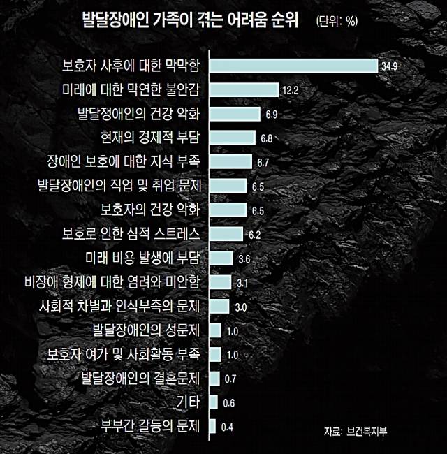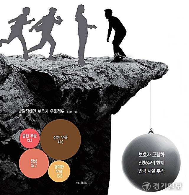 이 같은 호소는 일부 부모의 과장이 아니다. 경기도 발달장애인 돌봄 실태 조사(2024년 1월)에서는 보호자 10명 중 4명꼴인 41.0%가 심한 수준의 우울감을 느끼고 있는 것으로 나타났다. 지난 1년간 ‘죽고 싶다’는 생각을 진지하게 한 적이 있다는 응답도 25.9%에 달했다. 발달장애인 돌봄 부담이 개인이 감당하기 어려운 수준에 이르렀음을 수치로 보여준다. 돌봄이 가족 내부에 집중된 구조 속에서, 보호자의 정신적·정서적 부담이 임계점에 다다르고 있다는 경고이기도 하다.