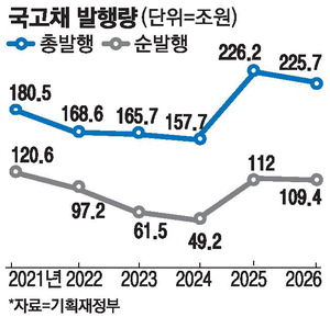 이 같은 재정 확장은 대규모 국채 발행으로 이어지고 있습니다. 정부는 2026년 국고채 총발행 규모를 225조7000억원으로 제시했습니다. 이 가운데 순발행 규모는 109조4000억원에 달합니다. 올해에 이어 2년 연속 순발행 100조원대입니다. 코로나19 국면을 제외하면 찾아보기 어려운 수준이며, 순발행 100조원대가 2년 연속 이어지는 것은 사실상 이번이 처음입니다.순발행이 100조원이 더 늘어난다는 것은 그만큼 나라빚이 100조원이 더 늘어난다는 이야기입니다. 결국 2026년 성장률 1.8%는 이 100조원 안팎의 신규 부채 위에 쌓아올린 성장입니다.