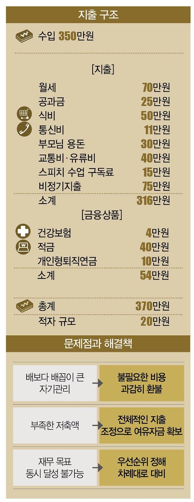 한달 식비는 50만원이고, 통신비로 11만원을 쓴다. 부모님 용돈은 30만원, 교통비ㆍ유류비는 40만원이다. 스피치 수업 구독료로는 15만원을 낸다. 여기에 의류비, 경조사비, 휴가비 등 1년에 걸쳐 쓰는 비정기지출은 월평균 75만원에 달한다. 지출 총합은 316만원. 금융상품에는 건강보험 4만원, 적금 40만원, IRP 10만원 등 54만원을 저축한다. 도훈씨는 한달에 370만원을 쓰고 20만원씩 적자를 보고 있다.