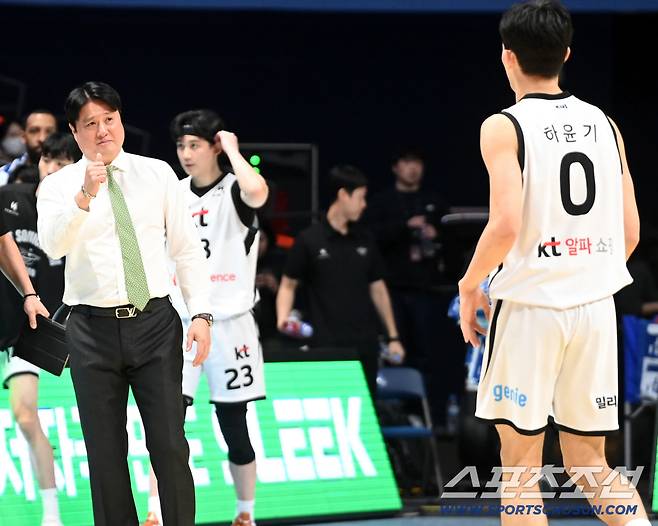 3일 고양소노아레나에서 열린 프로농구 고양 소노와 수원 KT의 경기. KT 문경은 감독이 하윤기에 엄지척을 선사하고 있다. 고양=허상욱 기자wook@sportschosun.com/2026.01.03/