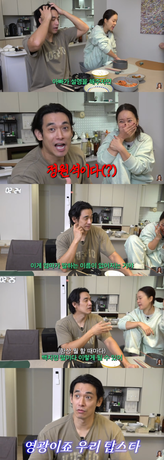 이에 정석원은 “너 이름이 없어진다는 걸 아빠가 설명해주자면, 아빠 이름도 없어졌다. ‘어 백지영 씨 남편?’, ‘어 백지영 남편? 정원석이다’, ‘정석현이다’. 이게 엄마가 말하는 이름이 없어지는 거야”라고 거들었다.