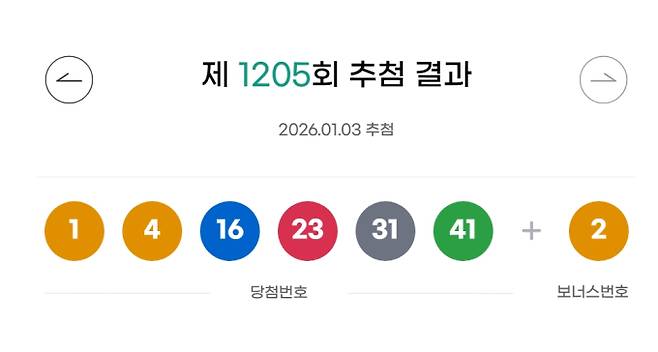 1205회 복권 로또 당첨번호 '1, 4, 16, 23, 31, 41' 보너스 번호 '2'