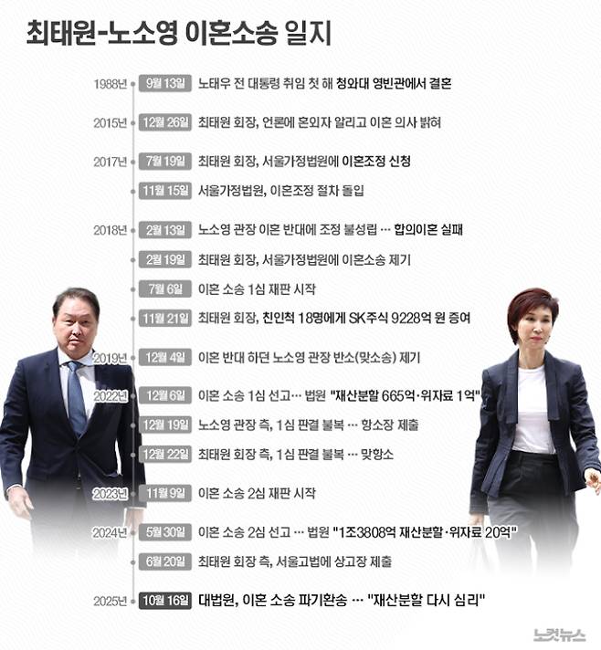 앞서 대법원 1부(주심 서경환 대법관)는 지난해 10월 16일 최 회장과 노 관장의 이혼소송 상고심에서 "최 회장이 노 관장에게 재산분할로 1조3808억 원을 지급하라"는 원심을 깨고 사건을 서울고법으로 돌려보냈다.