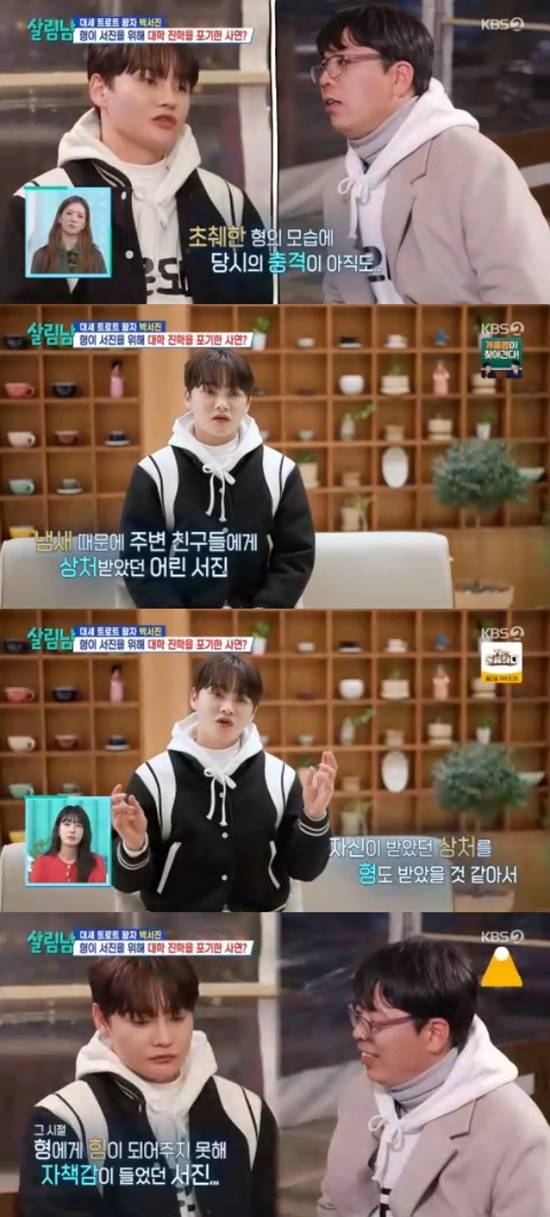 박서진은 "제가 냄새에 민감한데 형을 데리러 갔을 때 그 주변의 냄새도 그렇고 형 몸에서 안 좋은 냄새가 나더라. 제가 겪었던 상황이 생각나기도 하고 안쓰러웠다"고 했다.