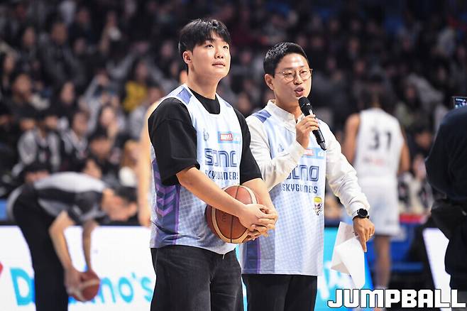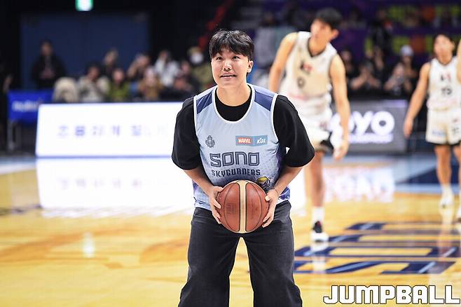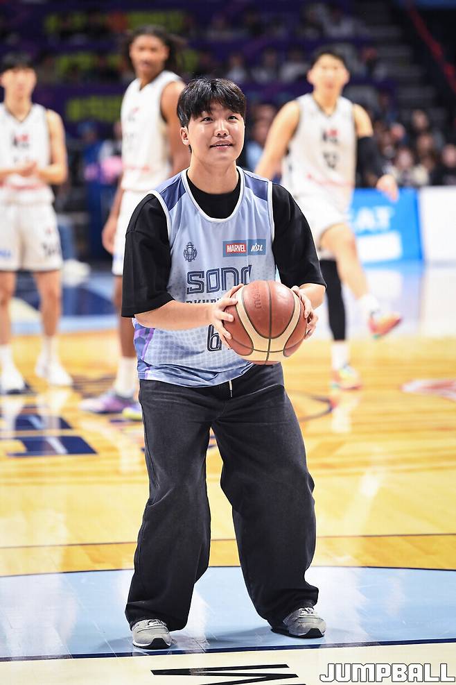 고양 소노 아레나에 일찍 도착한 정우주는 시투 연습에 나섰다. 그러나 그에게 생소한 농구는 쉽지 않았다. 실전에서도 3번의 기회가 있었으나 모두 림을 빗나갔다. 그의 표정에는 아쉬운 표정이 보였다.