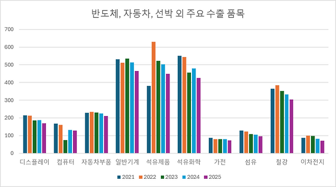 수출 성장을 이끈 주역은 다름 아닌 반도체입니다. 전체 7000억 달러 중 약 1600억 달러 이상을 반도체가 책임졌을 것으로 보입니다. 반도체를 제외한 다른 항목을 살펴보면 자동차, 선박, 바이오헬스 등은 전년도 기록을 경신하며 성장세를 이어가고 있지만, 다른 우리나라의 주력 수출 품목들은 2021년 이후 뚜렷한 하락세를 보이고 있습니다. 디스플레이, 컴퓨터, 석유제품, 석유화학, 가전, 섬유, 철강, 이차전지 등이 대표적입니다.