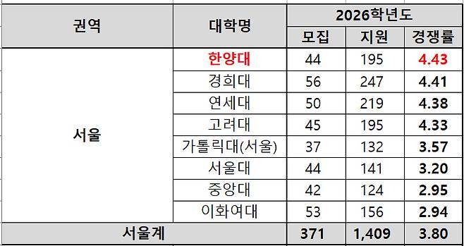 각 권역에서 경쟁률이 가장 높은 곳은 ▲서울권 한양대(4.43대 1) ▲경인권 인하대(10.31대 1) ▲강원권 가톨릭관동대(18.44대 1) ▲대구경북 대구가톨릭대(19.08대 1) ▲부울경 고신대(24.65대 1) ▲충청 순천향대(23.90대 1) ▲호남 전남대(6.18대 1)이었다. 제주대는 4.33대1을 기록했다.